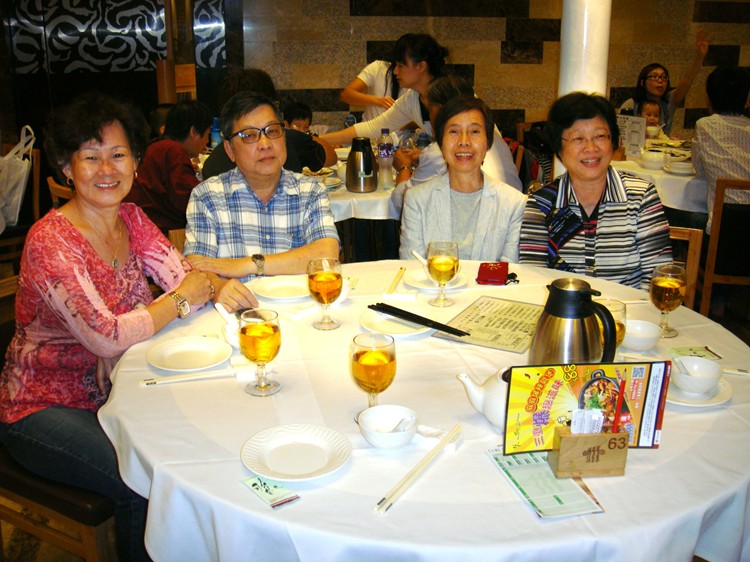 (左至右)經已攀登中國黃山,遊罷張家界,羅惠華丈夫梁根球和賢妻,9月29日在香港青衣城稻香大酒樓,與定居香港的同學洪佳、劉桂寧、曾慧珍和曾慧珍丈夫鍾洪濟一起聚餐的時候,毫無倦意,精神奕奕與大家歡談。他們在香港逗留到10月初才打道回府。