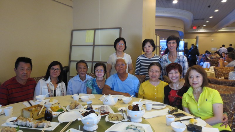 張惠民和梁少英親自到機場迎迓遠道而來的「稀客」後,大家一起去酒樓午膳,品嚐廣東點心。(左起坐)梁少英,顏秀慧,孫人先,人先大嫂。(後排男士左起)孫人先丈夫周永嘉,人先大哥,陳敬國。