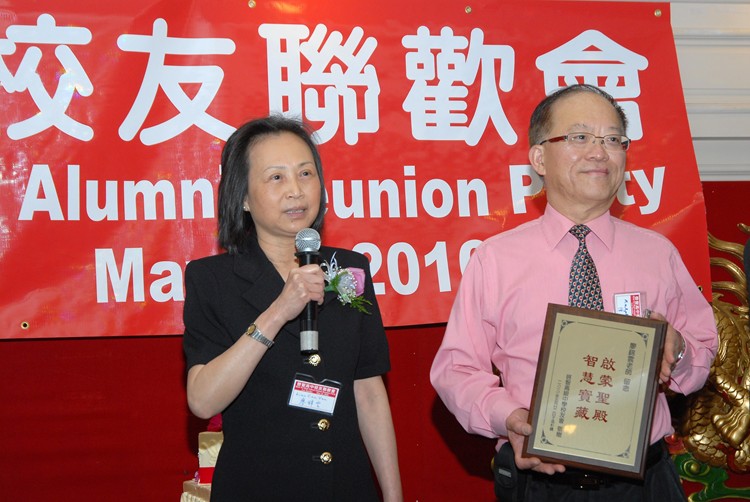 #91 1969年畢業校友韓蓮美代表大會贈送紀念獎牌給梁景輝老師。韓蓮美校友是此次聯歡晚會的發起人與主持人之一。