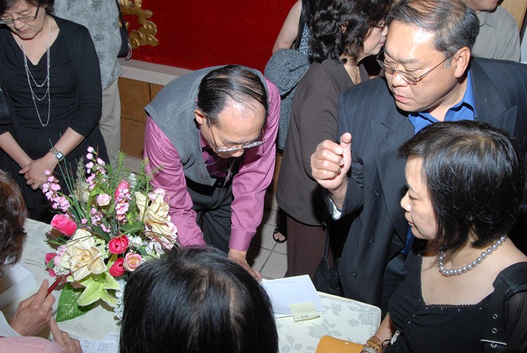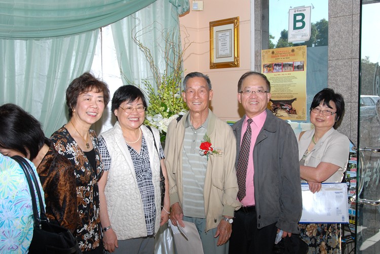 #85 69年畢業校友張麗桃朱景光伉儷向梁景輝老師問候。旁邊是廖錦雲老師與謝燕媚(69年畢業生)