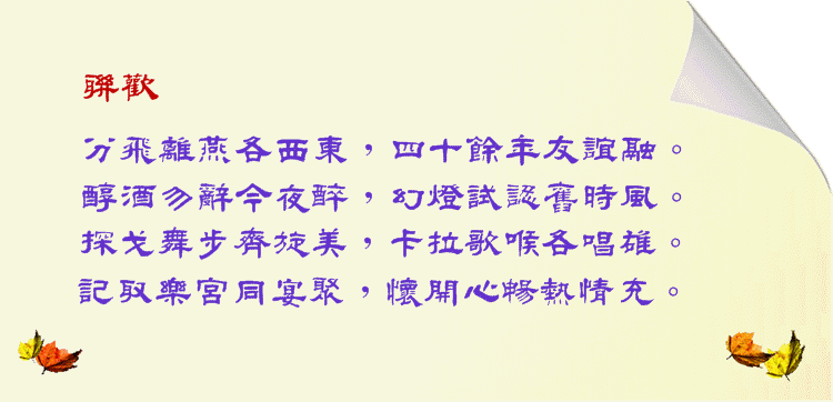 註: 喜瑞都 : Cerittos, California。 朋儔 : 朋友伙伴 。 六岔路口 : 啟智學校在六岔路口附近。 影像句 : 當夜師長同學今昔照片幻燈引人入勝, 耐人尋味。