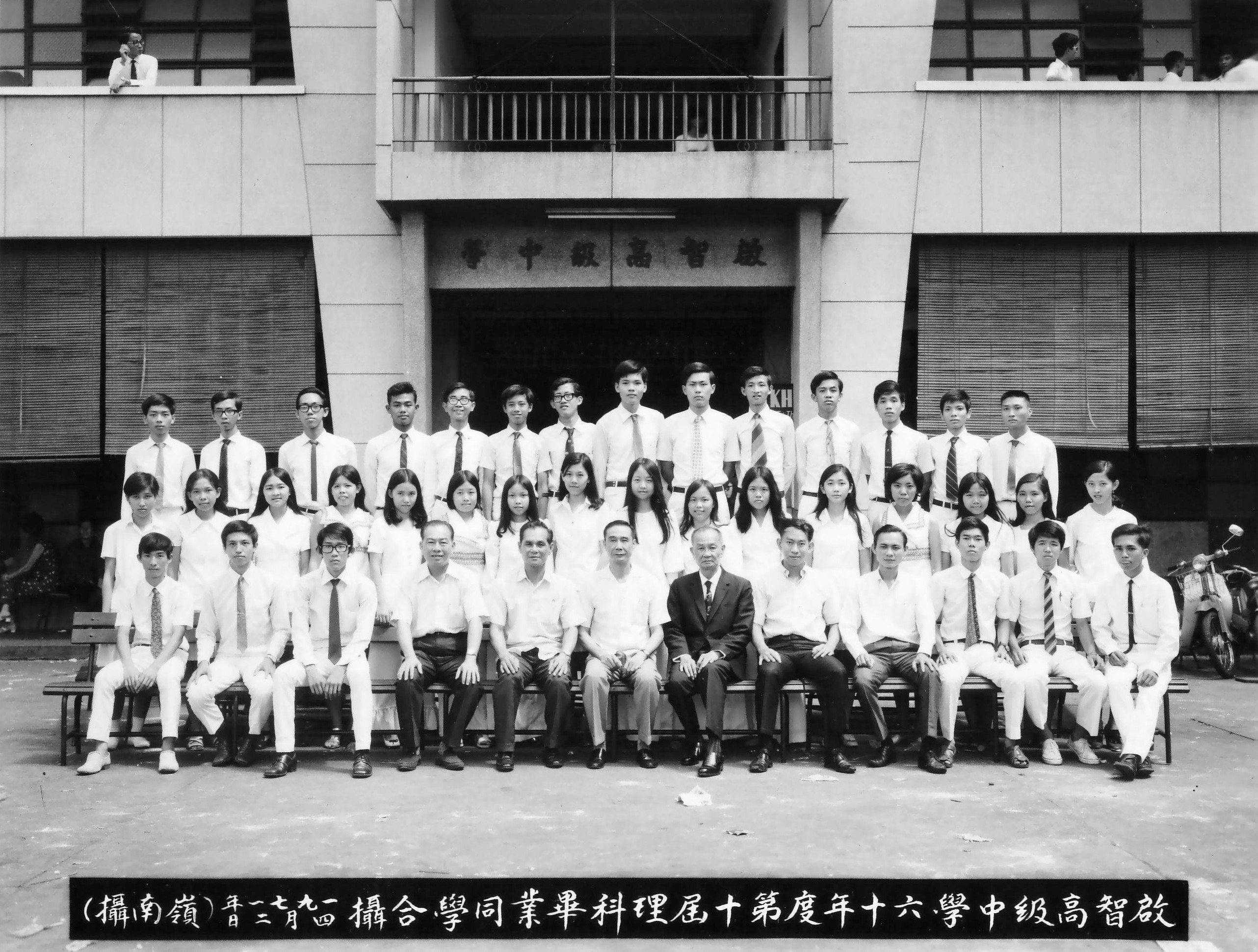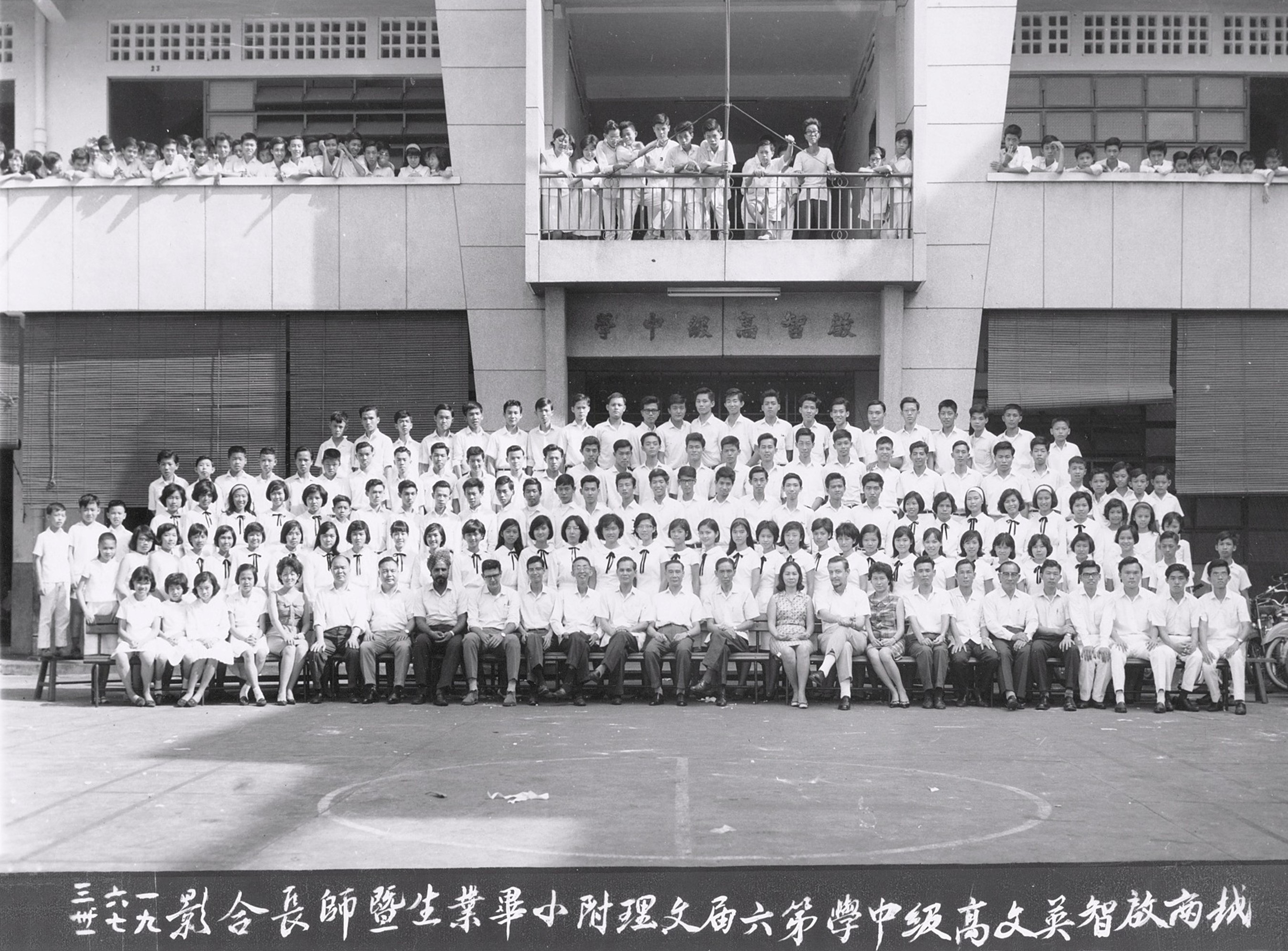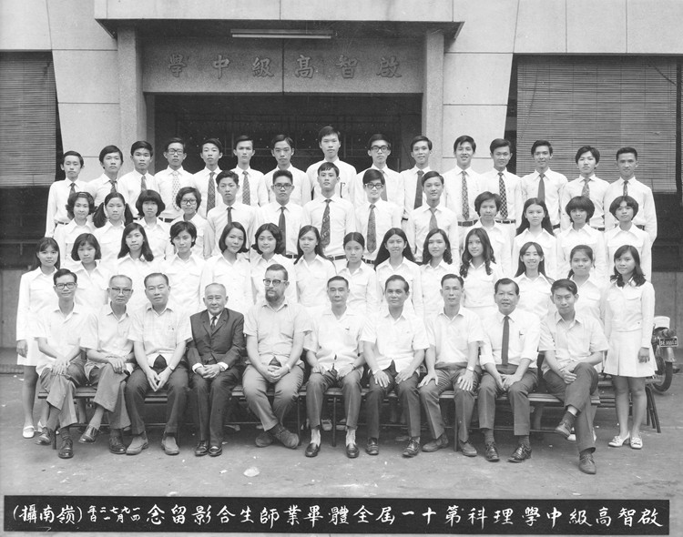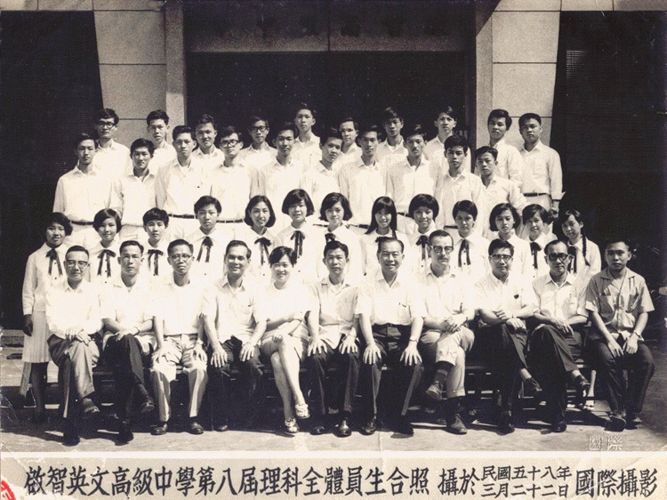 後排:黃冠群 李克元 林東光 林少祺 鄧細祥 何偉國 曾廣植 老來健 陳楊章 陳楊彬 三排:林承康 李啟仁 劉克孝 陳庭琥 方永祥 陳家勉 陳家勵 王永健 黃偉忠 陳年好 二排:王潤蘭 余秋雲 林愛珍 王白珠 葉麗卿 王秀芬 蔡美珍 鄧裕翎 葉玉英 刑麗華 彭麗真 王錦蘭 吳金科 前排:張弘光老師(物理) 梁景輝老師(文法) 曾老師(讀本) 馬老師(代數, 解析幾何) 馬太太 陳敬騰老師(三角) 葉老師(事務主任) Mr Cerceul(英文老師) 莫成銳老師(英文) 事務處職員阮先生 朱榮長老師(投影幾何, 微積分)