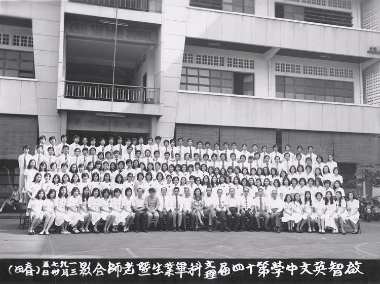 後排:歐楷泉、白 圻明、洪建福、黎輝精、李海淩、馮經雄、楊維邦、馮伯旋、駱志強、蘇耀南(已故)、曾清祥、張業法、符志雄、盧鴻孫、陳國城、周樹根、黃信福、余錦成、陳栢榮、鍾詩然、戴立璽、歐錦泉 三排:馮秀正(已故)、張永通、韓蓮美、劉桂寧、曾慧珍、葉熙甯、蕭艽子、王如萍、呂少芳、李秀杏、林露瑩、顔秀慧、莫秀蘭、陳淑萍、江蕙萍、莫秀英、梁少娟、梅家寳(已故) 二排:王燕勤、羅蕙華、張蕙芬、駱少芬、徐硯竹、謝燕媚、王錦春、郭雪蘭、吳雪花、梁金嬋、劉淑嫻、黃楚珠、XXX、李美華、王鳳堅、陳秀芳、楊惠馨 前排:夏愛蝶、張宏光老師、梁景輝老師、馬太太、馬老師、莫成鋭老師、Mr Cerceul、陳敬騰老師、曾老師、阮先生、梁少英
