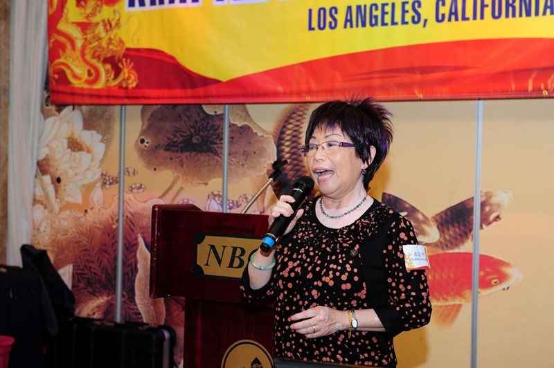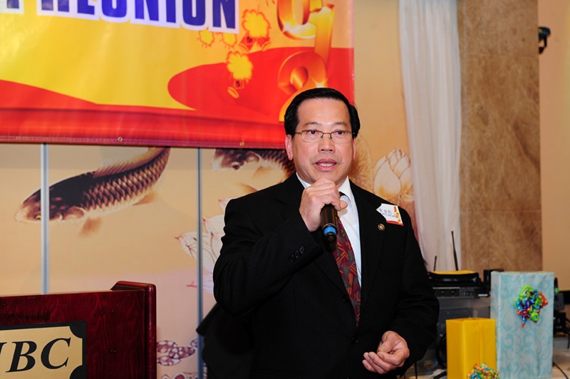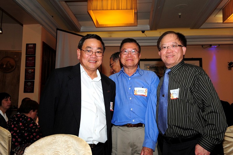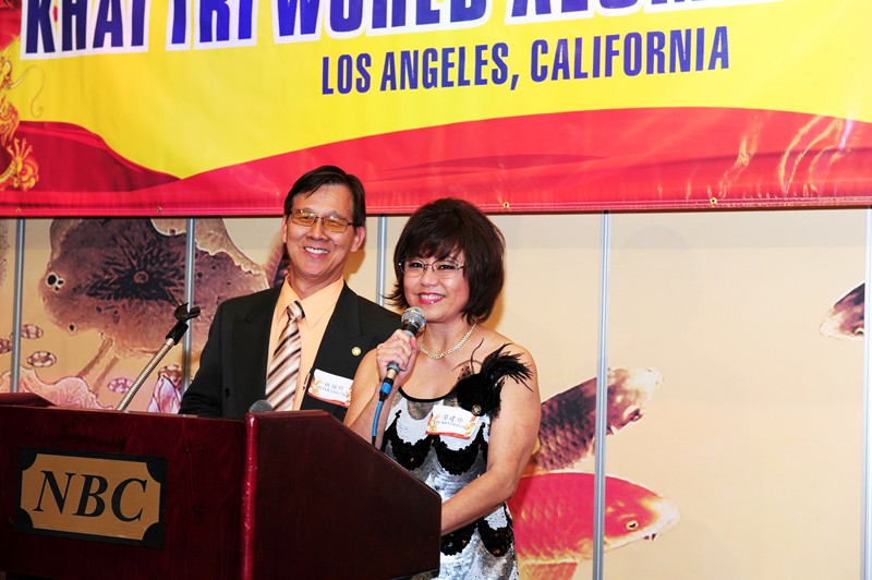2012年啓智海外校友第二屆聯歡晚會籌備組組長73年文科葉強校友上台致辭。 左邊是兩位金牌司儀:姚福照(72年理科)、廖建珍(76年)